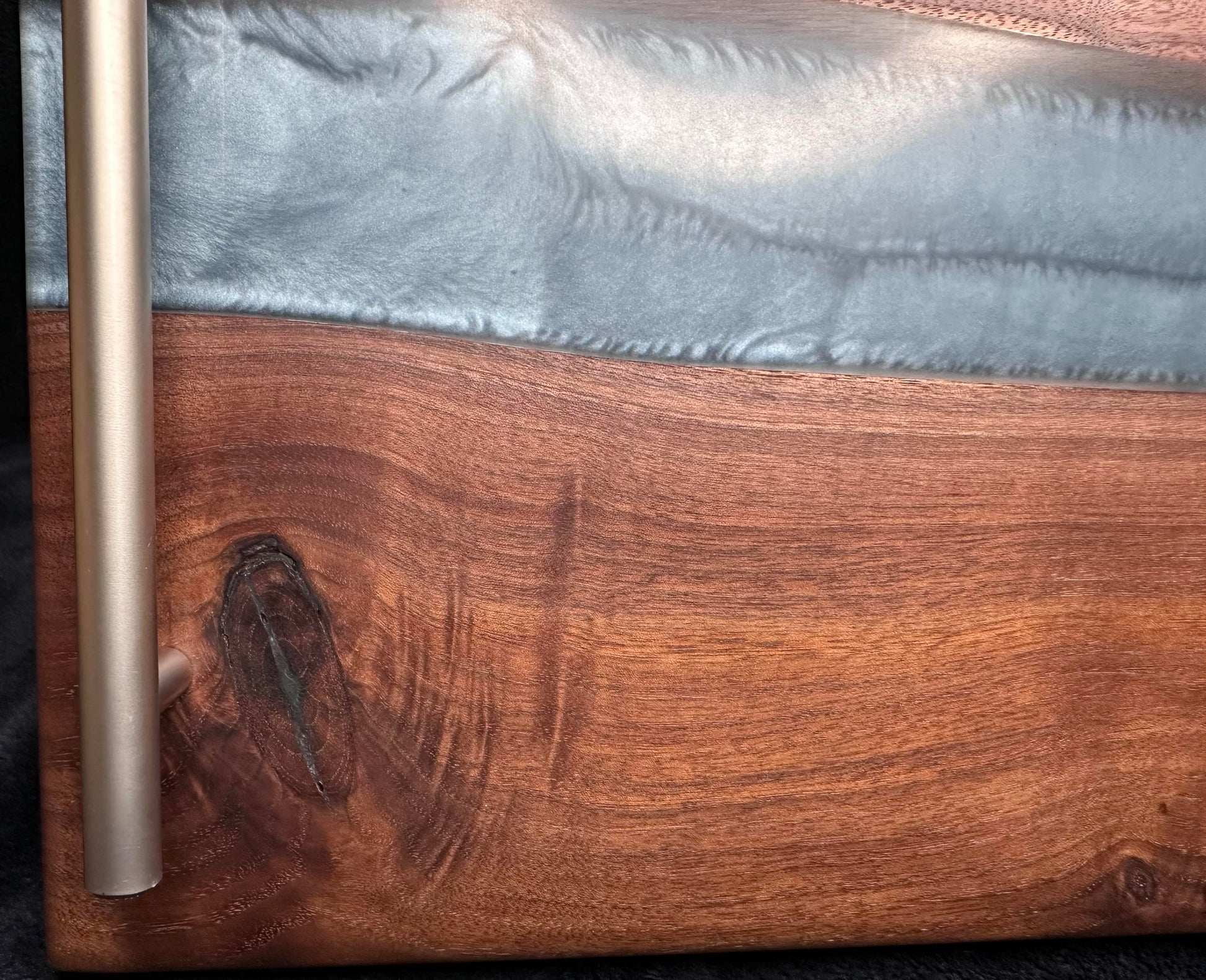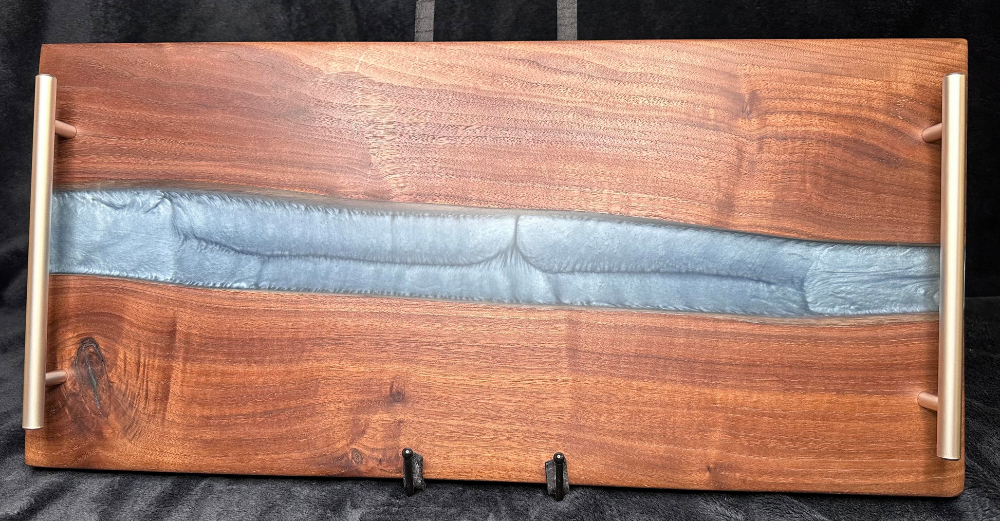 Built from rich black Iowa walnut, the natural depth of the wood brings warmth, contrast, and unmistakable character. Cutting through the center is a flowing epoxy river of silver/blue swirls. The metallic shimmer catches light differently from every angle, giving the board motion even when it’s sitting still.