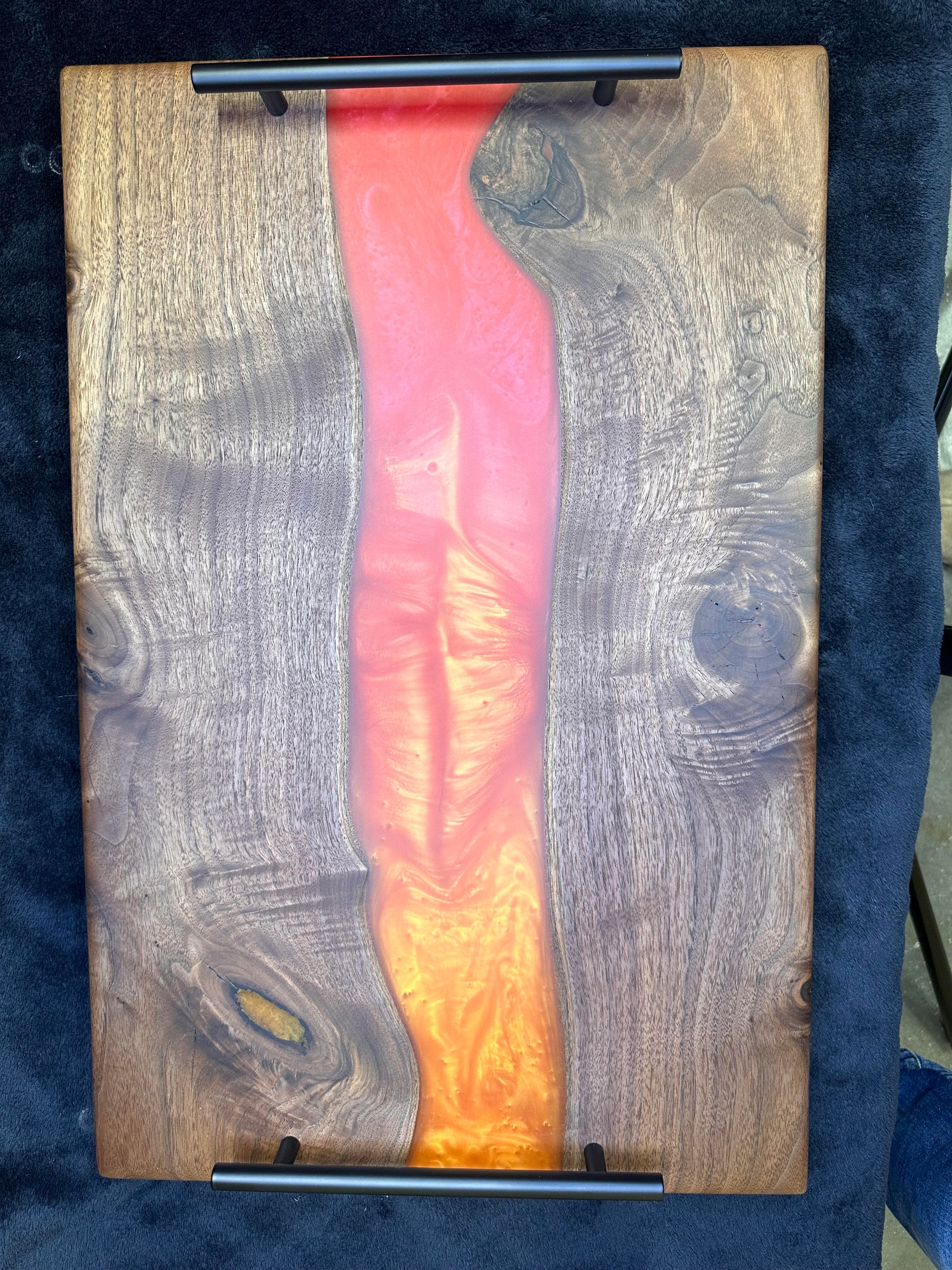 Made from solid walnut from our Iowa Farm, the grain rolls deep and dark with natural knots and movement that tell the story of the tree itself. Cutting through the center is a striking epoxy river that fades from molten gold into deep crimson red, flowing like liquid fire through the wood. The color shift isn’t subtle — it’s intentional, dramatic, and impossible to ignore.